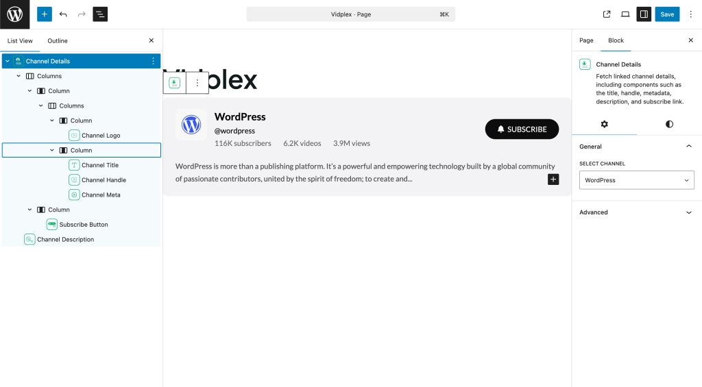 Fetch linked channel details, including components such as the title, handle, metadata, description, and subscribe link.