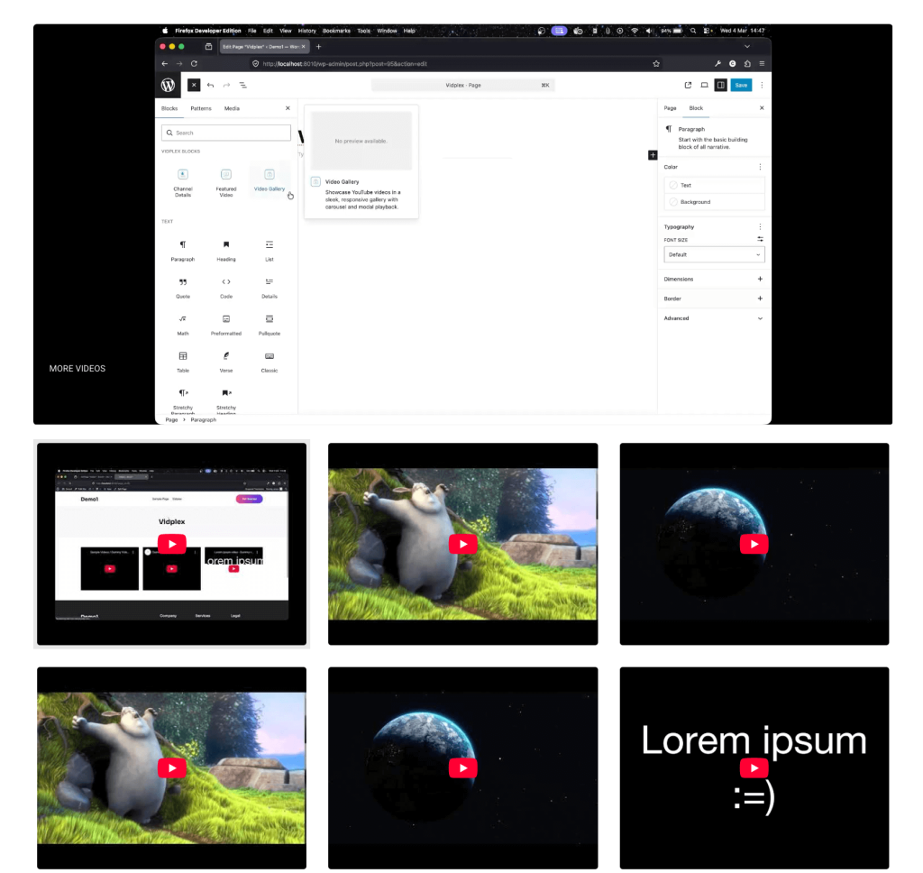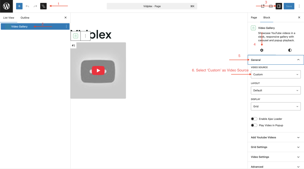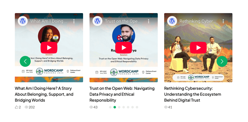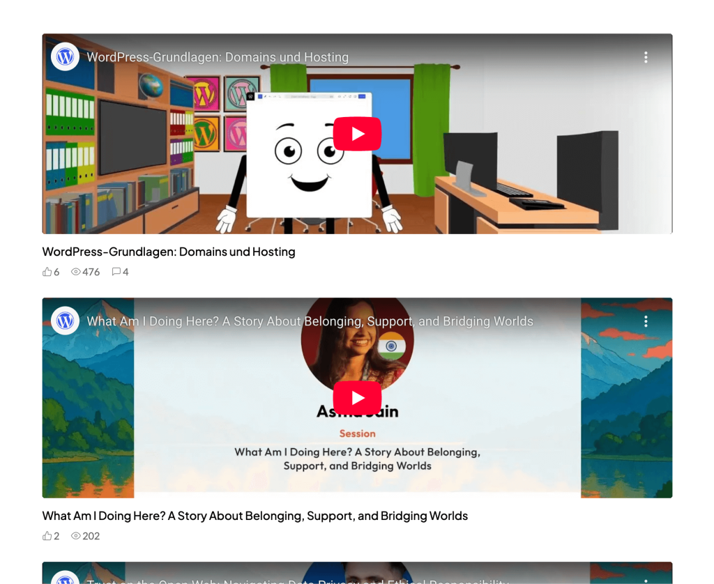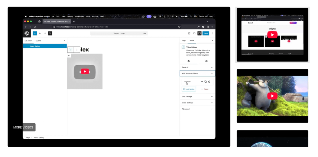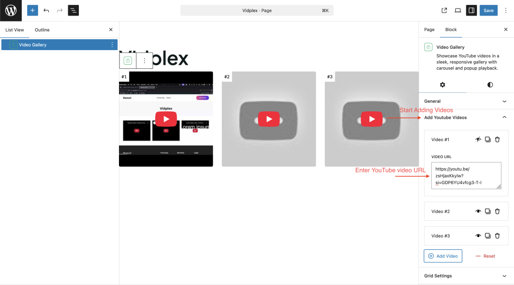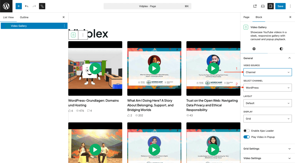 Link individual videos via URL or automatically fetch videos from any channel. Choose from three flexible layout modes to match your design: Default, List, or Gallery.